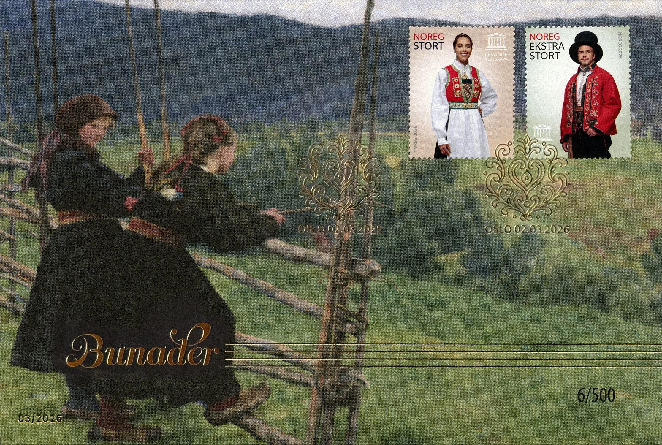 Frimerker, konvolutt og førstedagsstempel for markeringen av at bunadsbruken i Norge er skrevet inn på UNESCOs liste over immateriell kulturarv. Dette markerer en internasjonal anerkjennelse av bunaden som en levende tradisjon, et håndverk og en sosial praksis med stor betydning for identitet og tilhørighet i det norske samfunnet. Immateriell kulturarv omfatter tradisjoner og kunnskap som videreføres mellom mennesker, som språk, ritualer, håndverk og sosiale skikker.